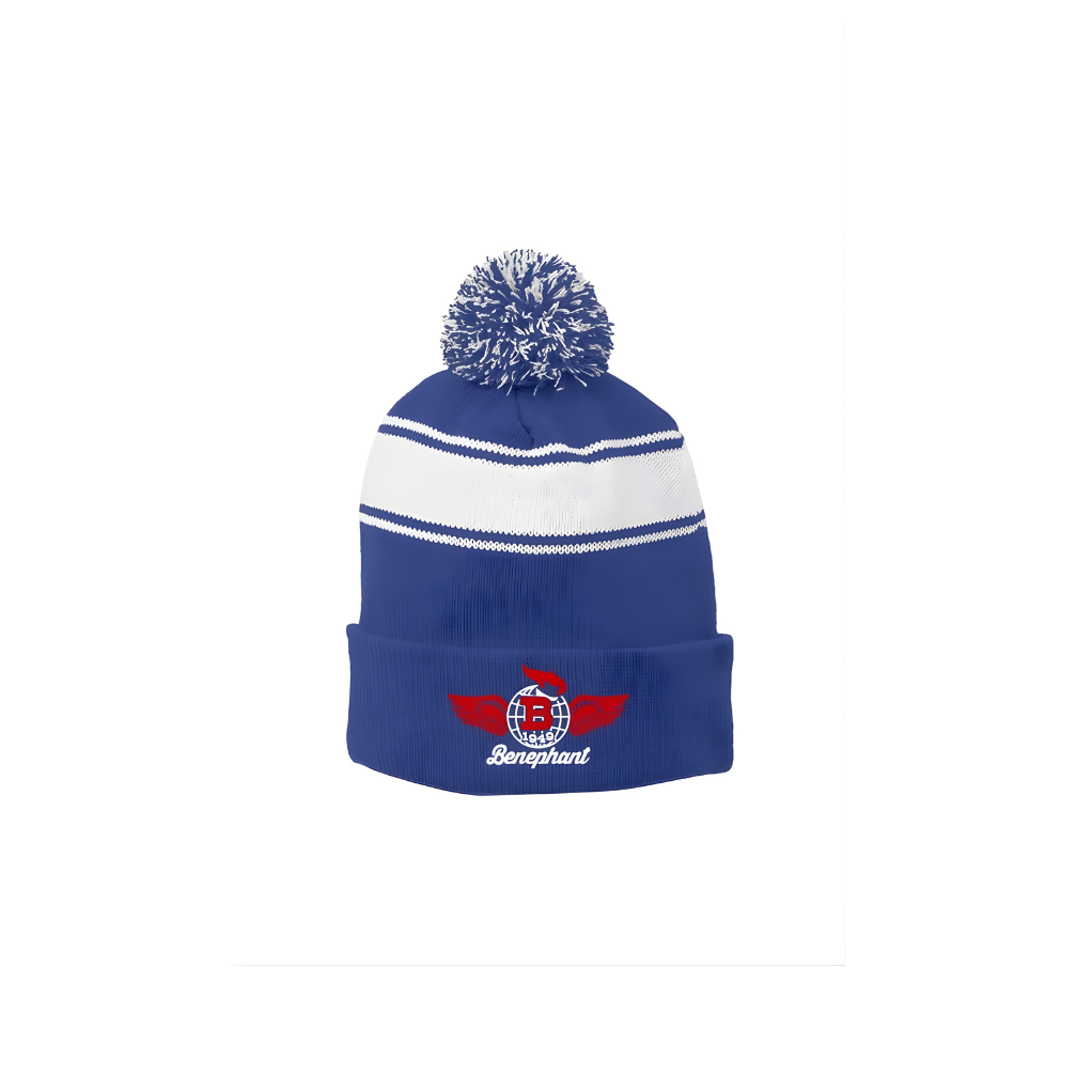 Classic sports varsity acrylic beanie with 3 stripe pattern and pom ball, embroidered front hem.